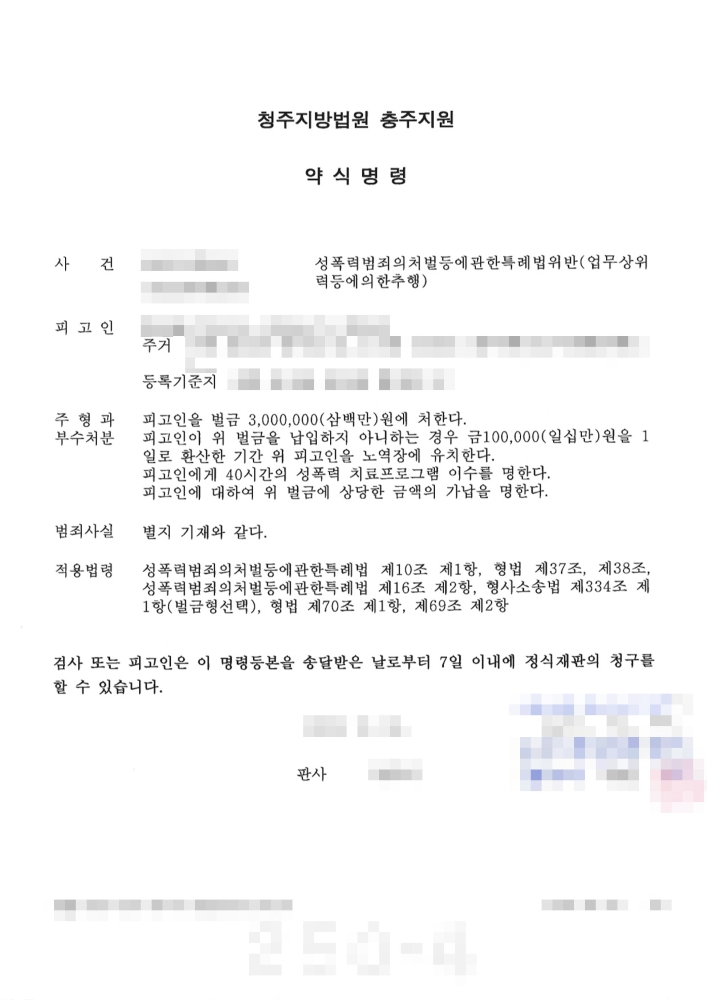 청주성범죄변호사가 조력한 이 사건은 피고인이 두 차례에 걸쳐 업무상 위력을 이용해 피해자를 추행한 혐의로 기소된 약식명령 사건입니다. 피고인은 부장으로 재직 중이었고, 피해자는 같은 회사 사원이었습니다.